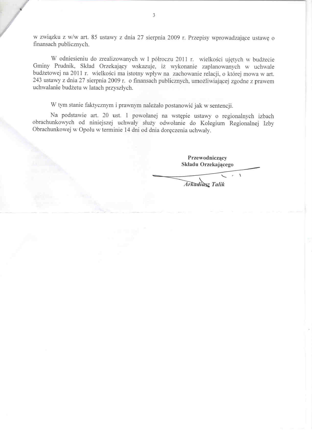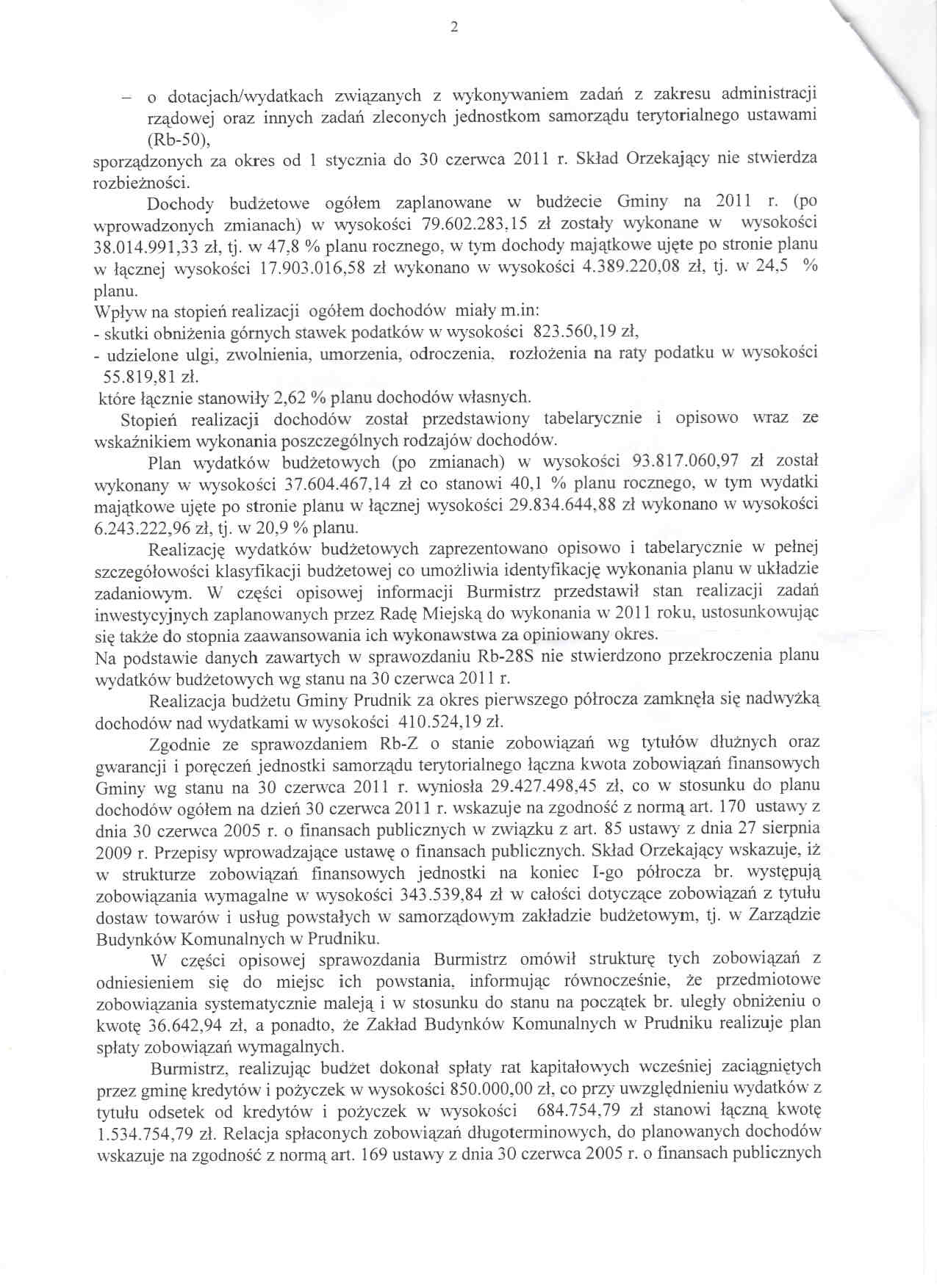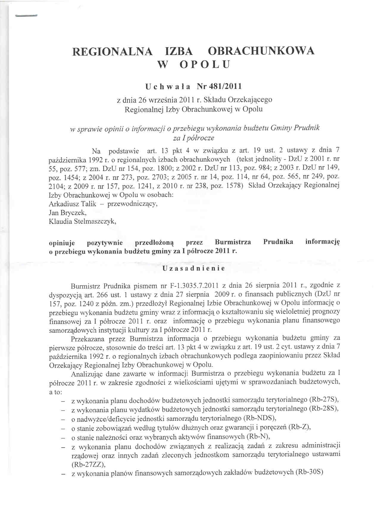 Uchwała Nr 481/2011 z dnia 26 września 2011 r. w sprawie opinii o informacji o przebiegu wykonania budżetu Gminy Prudnik za I półrocze