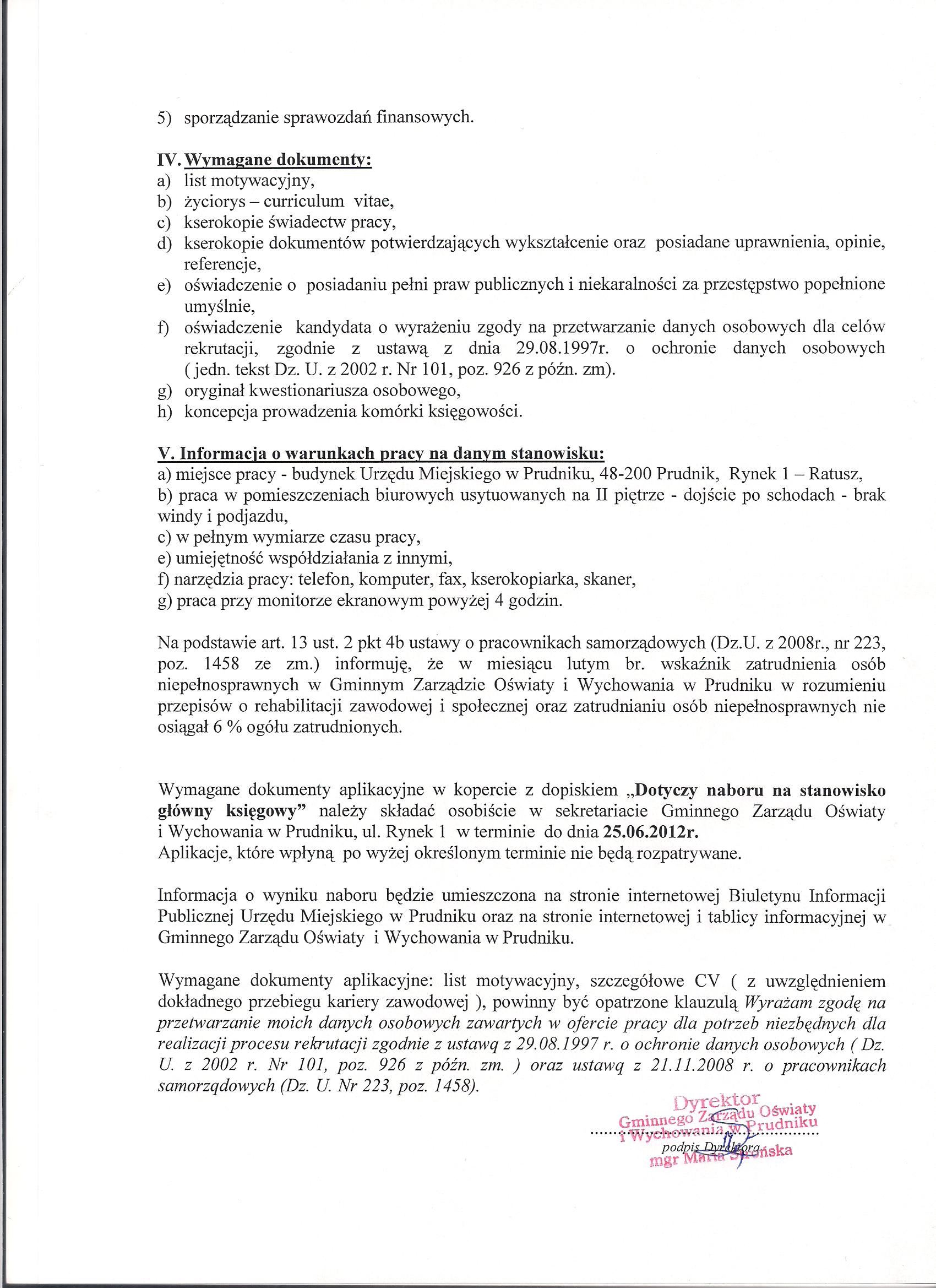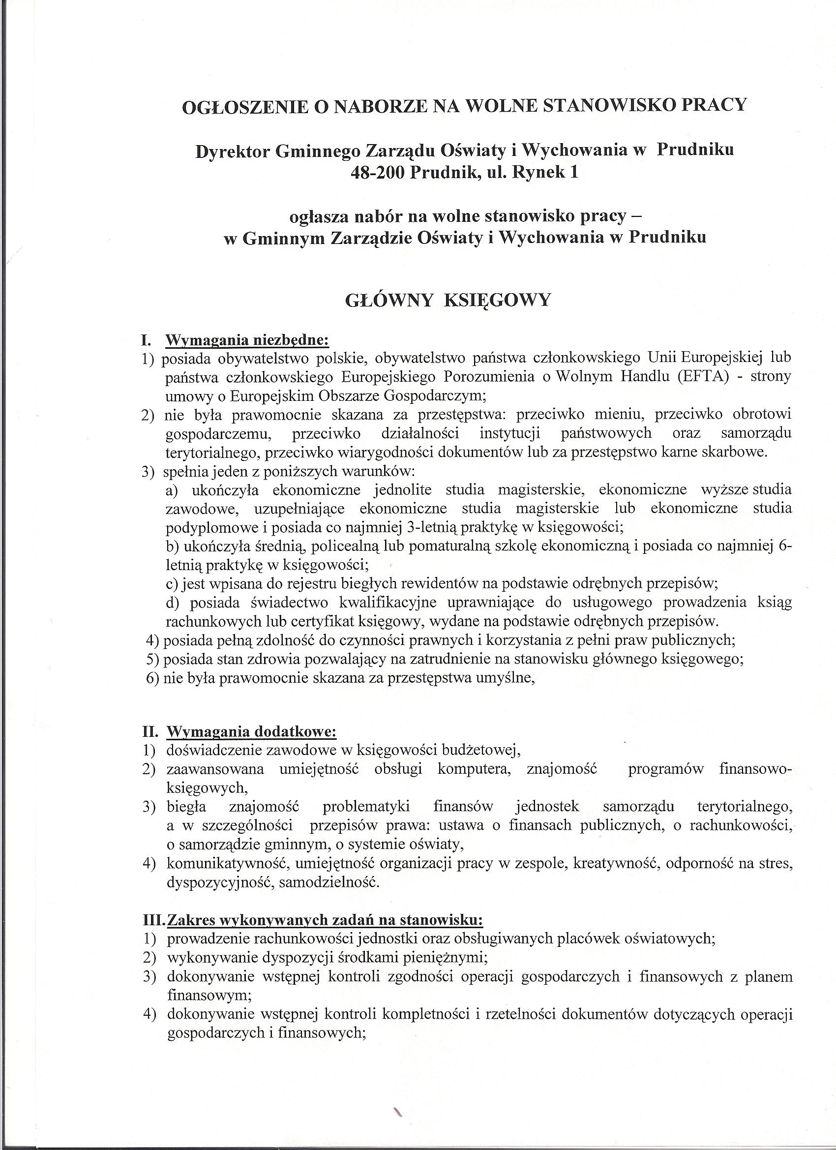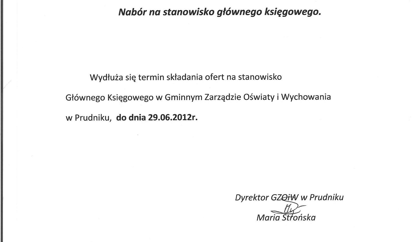 Nabór na wolne stanowisko Głównego Księgowego w GZOiW Prudnik