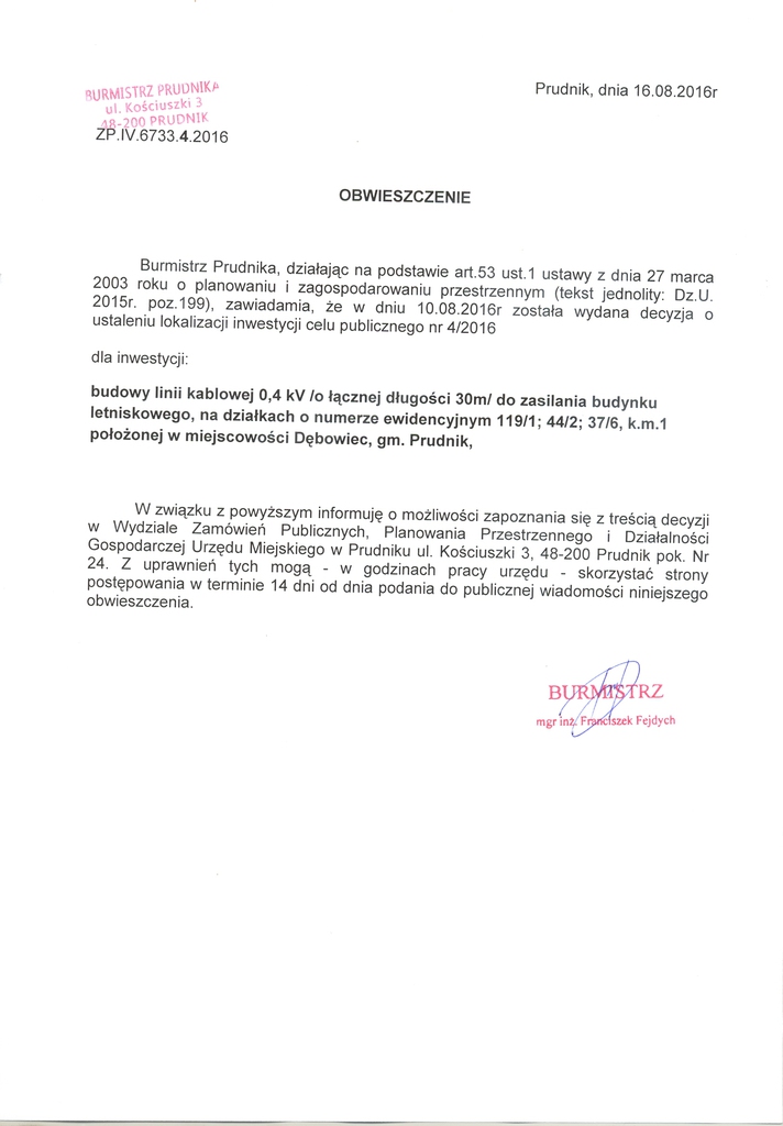 Decyzja Burmistrza Prudnika Nr 4/2016 o ustaleniu lokalizacji inwestycji celu publicznego z dnia 10.08.2016r