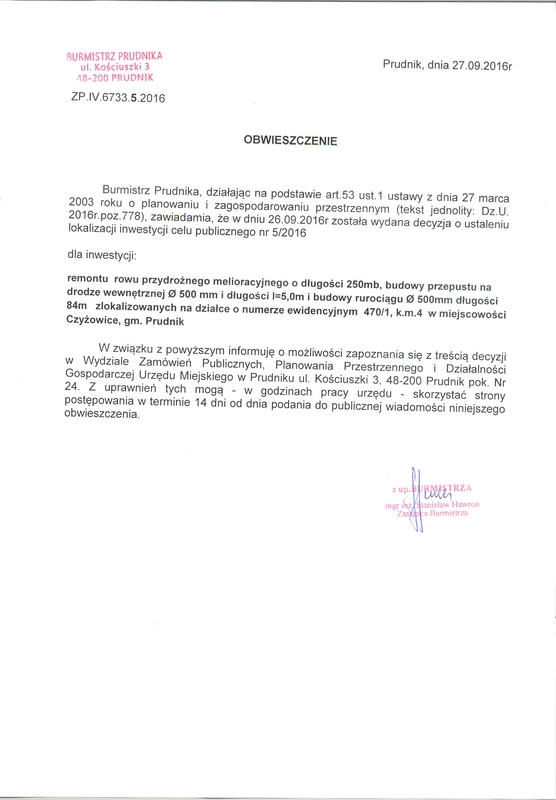 Decyzja Burmistrza Prudnika Nr 2/2016 o ustaleniu lokalizacji inwestycji celu publicznego z dnia 25.07.2016r